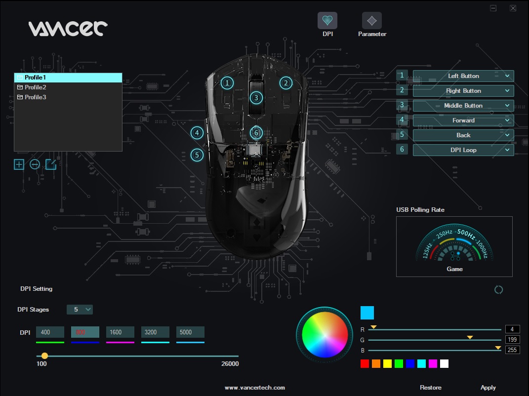 소프트웨어를 통해서 DPI 의 갯수와 수치를 조정할 수 있고, 색상, 버튼설정, 폴링레이트 를 변경할 수 있습니다.