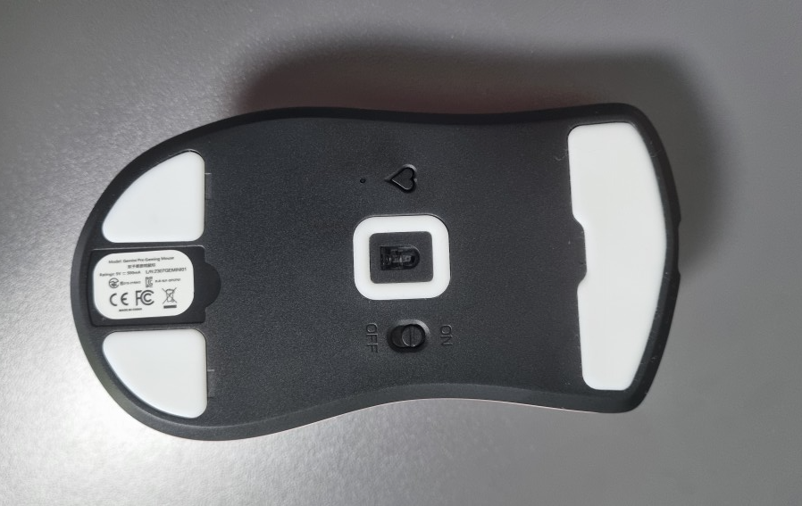 마우스 바닥면에 피트를 살펴보면 위쪽은 일체형이고 아랫쪽은 좌 우로 피트가 분리, 센서부분 가운데에도 피트가 부착되어있습니다. 왼쪽 하트모양은 폴링레이트 버튼이고 오른쪽에는 전원 ON/OFF 버튼이 있습니다.
