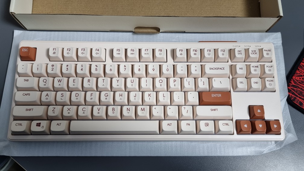 키캡에 글씨가 뚜렷하게 프린트되어있어서 잘보이고 ESC와 ENTER, 방향키의 색상이 달라 구분하기 쉽습니다.