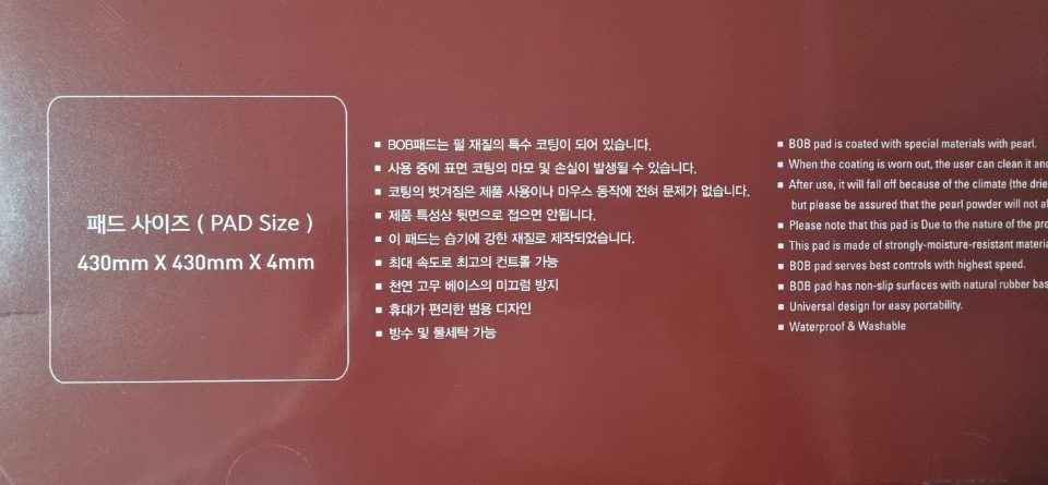 BOB 밥패드 PRO V1 게이밍마우스패드는 제품 컬러에 따라서 같은 색상으로 포장되어 있는거 같습니다.
