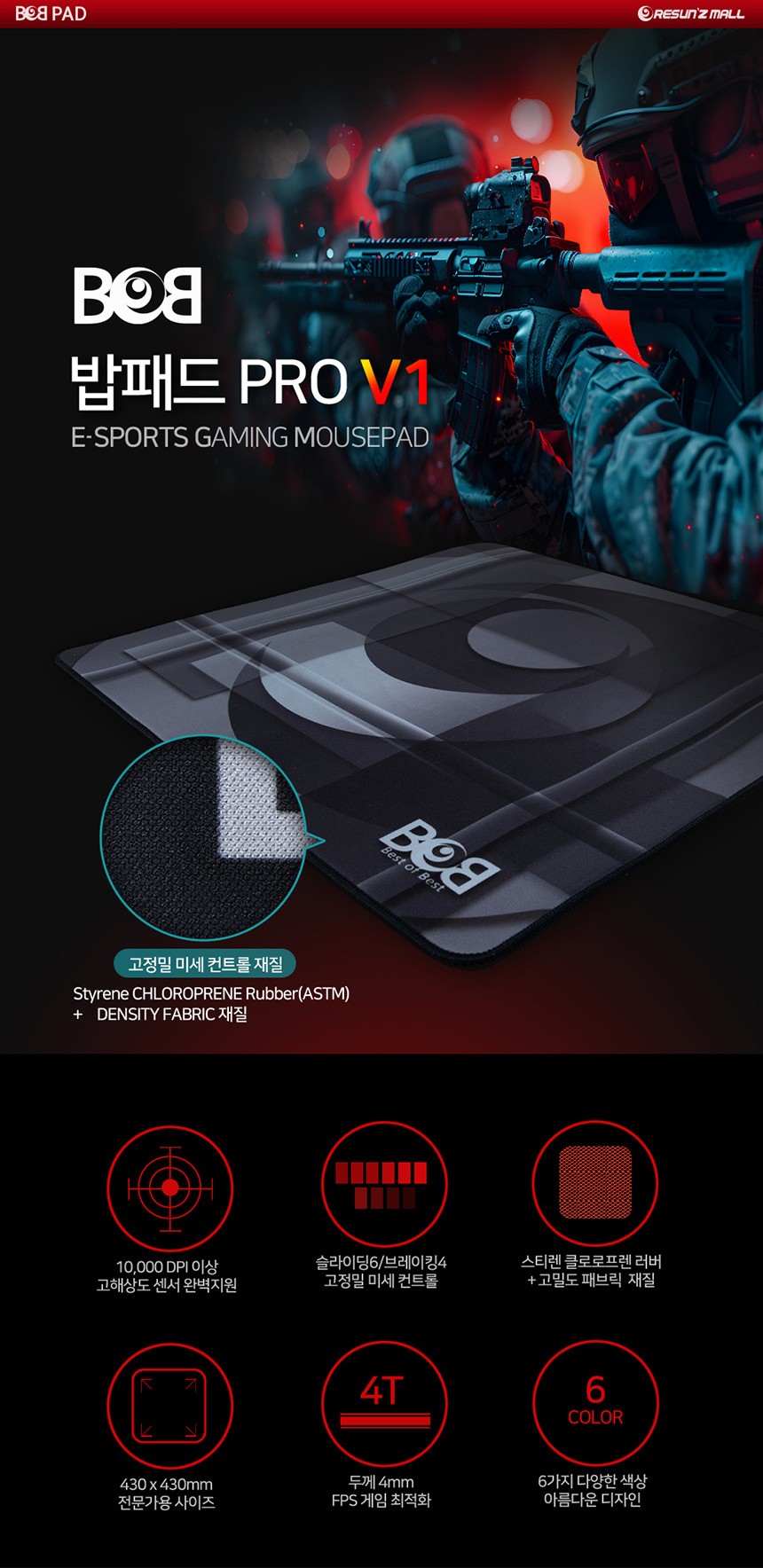 BOB 밥패드 PRO V1 게이밍마우스패드는 스티렌 클로로프렌 러버 + 고밀도 패브릭 재질로 되어있습니다.